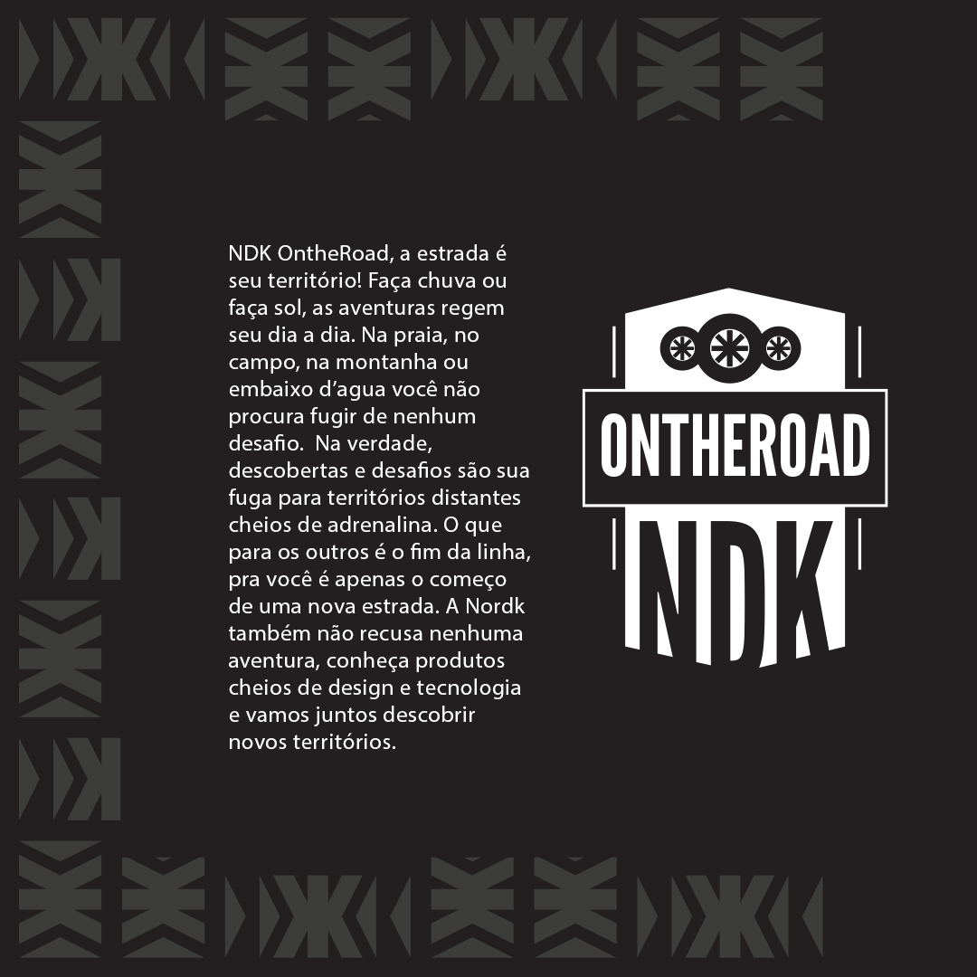 NDK OntheRoad, a estrada é seu território! Faça chuva ou faça sol as aventuras regem seu dia a dia. Na praia, no campo, na montanha ou embaixo d’agua você não procura fugir de nenhum desafio. Na verdade, descobertas e desafios são sua fuga para territórios distantes cheios de adrenalina. O que para os outros é o fim da linha, pra você é apenas o começo de uma nova estrada. A Nordk também não recusa nenhuma aventura, conheça produtos cheios de design e tecnologia e vamos juntos descobrir nosso território.
